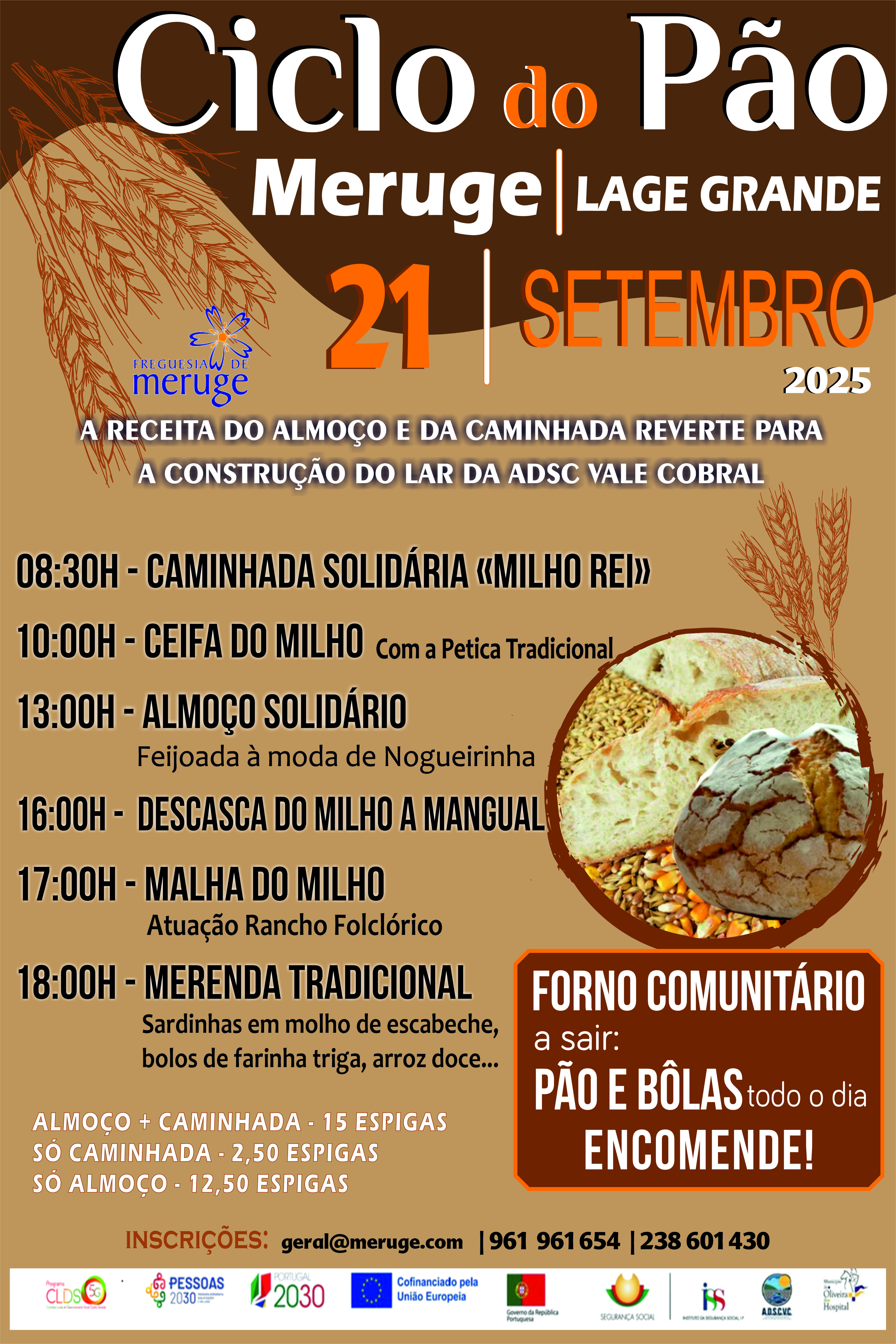 No próximo dia 21 de setembro de 2025, a freguesia de Meruge (Lage Grande) recebe mais uma edição do Ciclo do Pão, um evento que recupera tradições ligadas ao ciclo do milho e à confeção do pão, num dia de partilha e convívio comunitário.