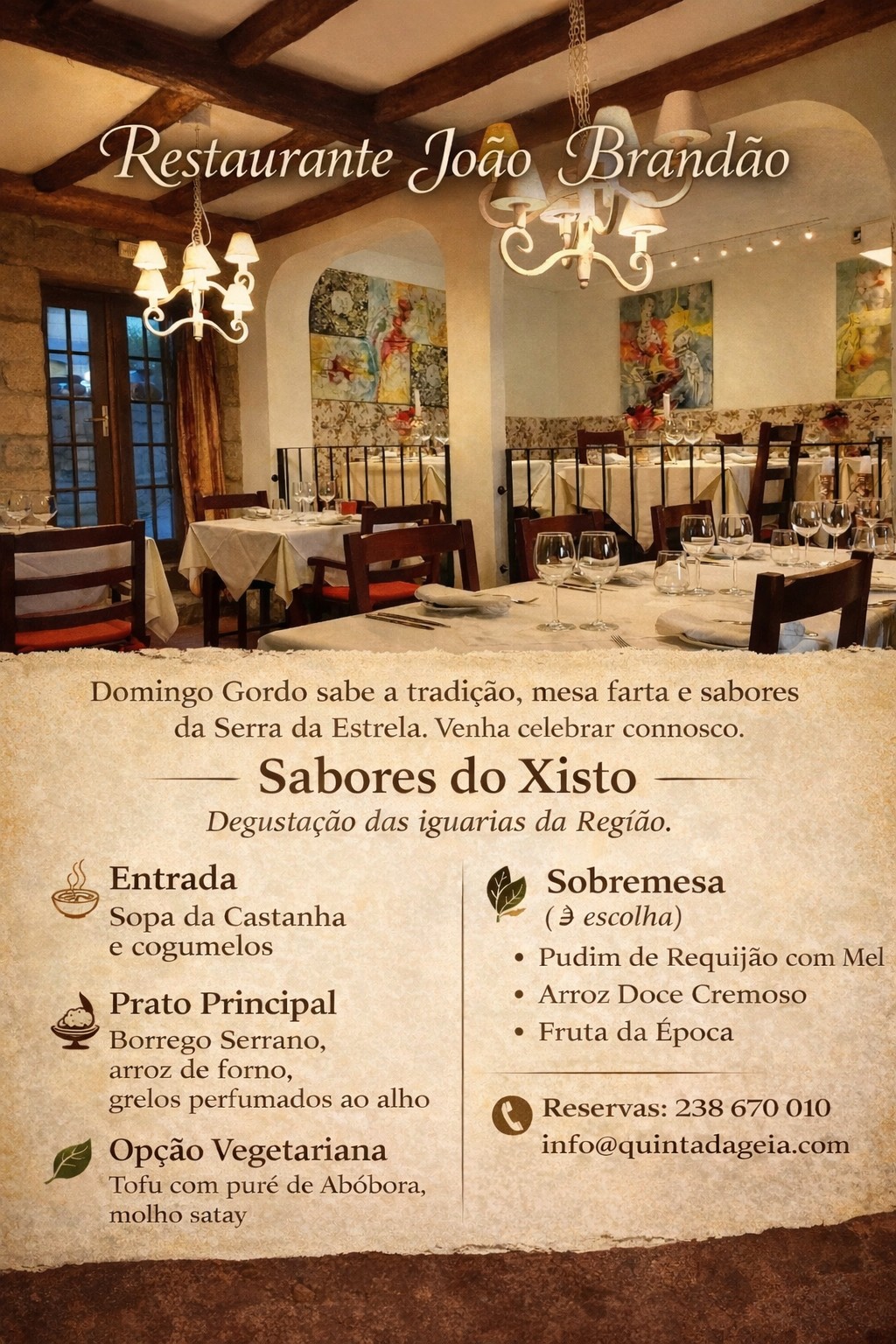 O Restaurante João Brandão, no Hotel Rural Quinta da Geia, convida a celebrar a tradição à mesa com a iniciativa Sabores do Xisto, uma degustação dedicada às iguarias típicas da Serra da Estrela, onde a autenticidade dos produtos regionais se cruza com a hospitalidade característica do território.