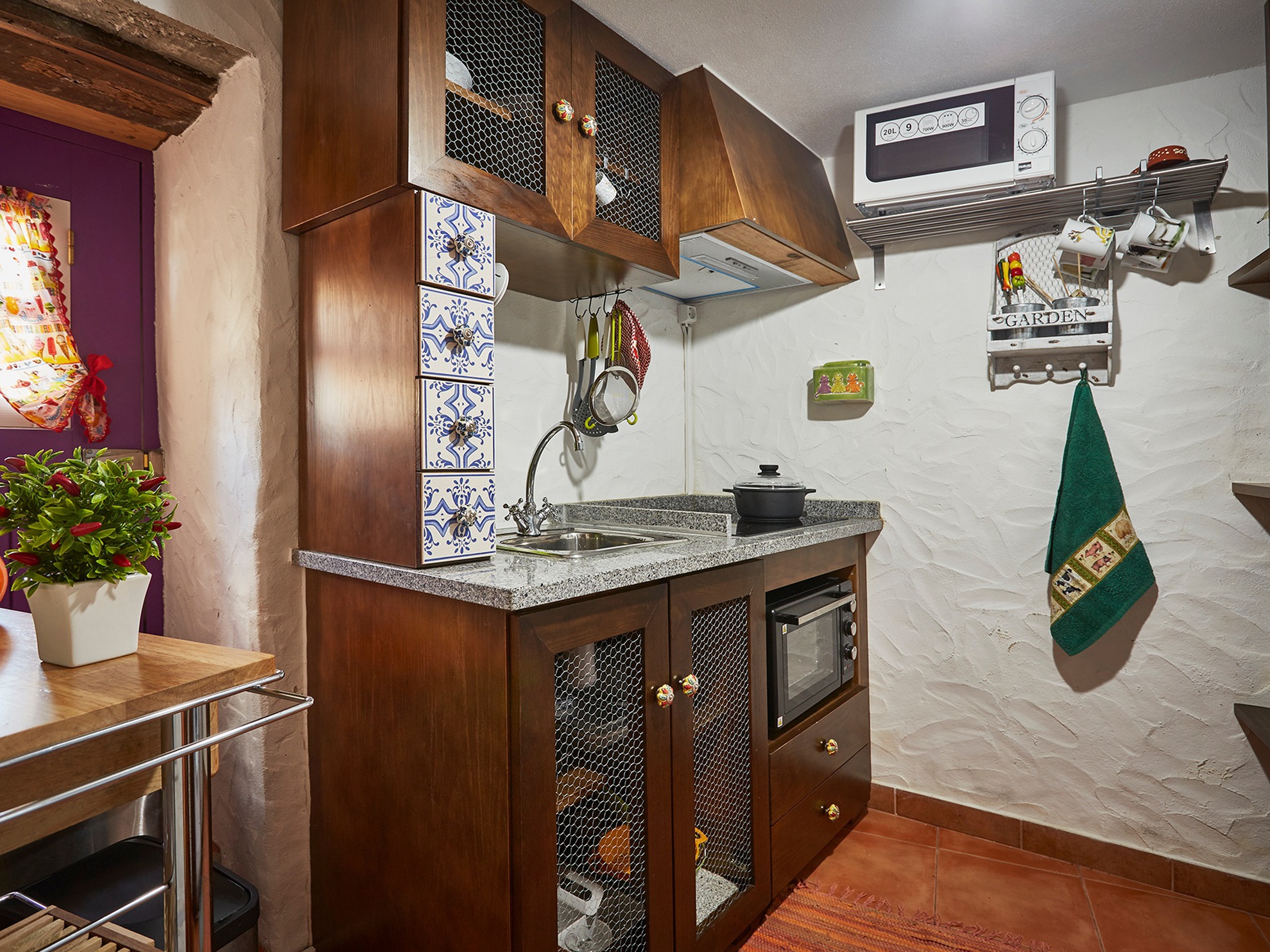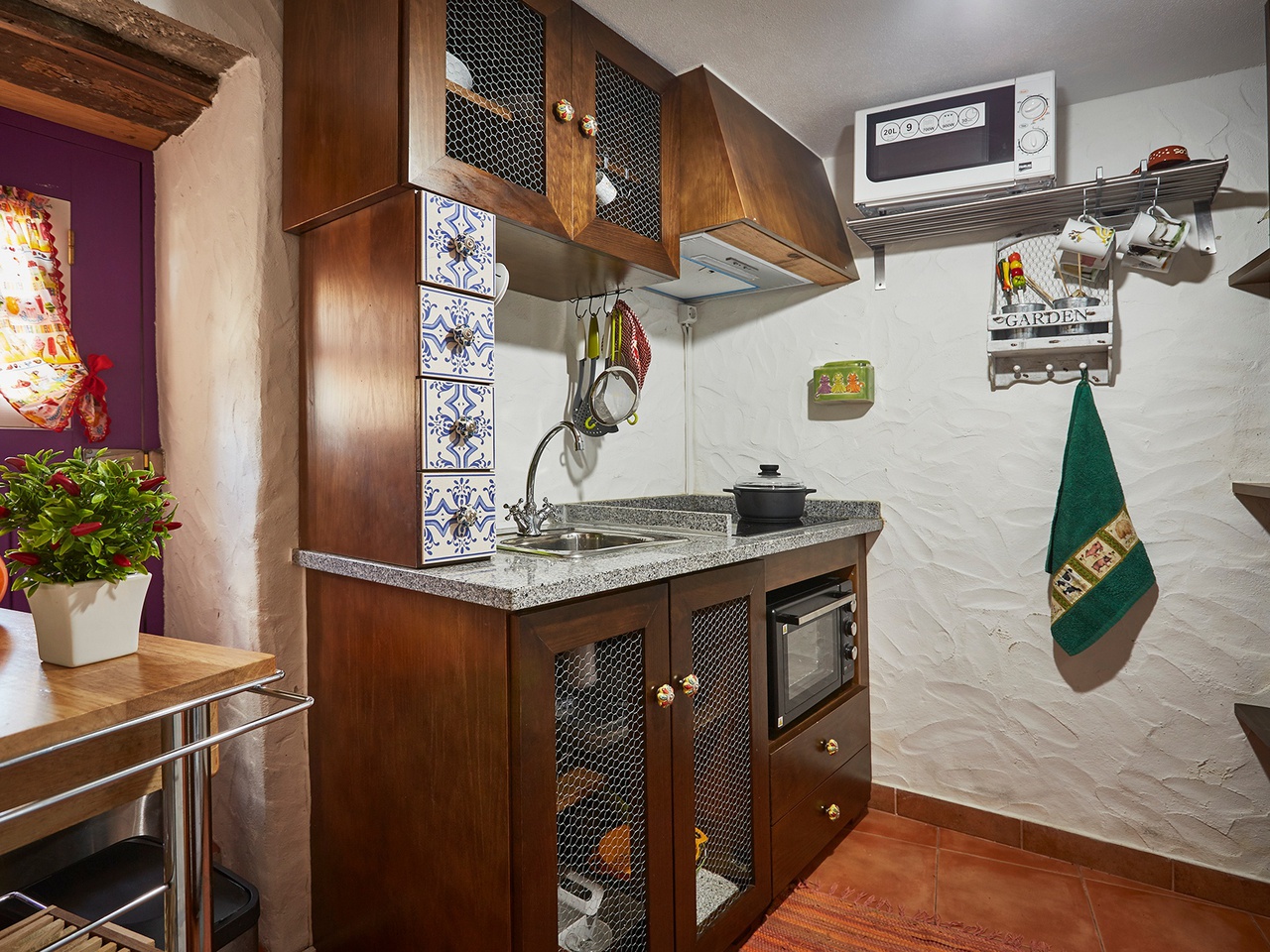 No 1.º piso, encontramos um hall, a sala comum com televisão, um quarto duplo com berço, a casa de banho e uma cozinha totalmente equipada. O quarto é amplo, com uma confortável cama, especialmente desenhada pela autora do projeto de restauro, com um berço grande, paredes em xisto e soalho e teto de madeira, roupeiro e duas rasgadas janelas.