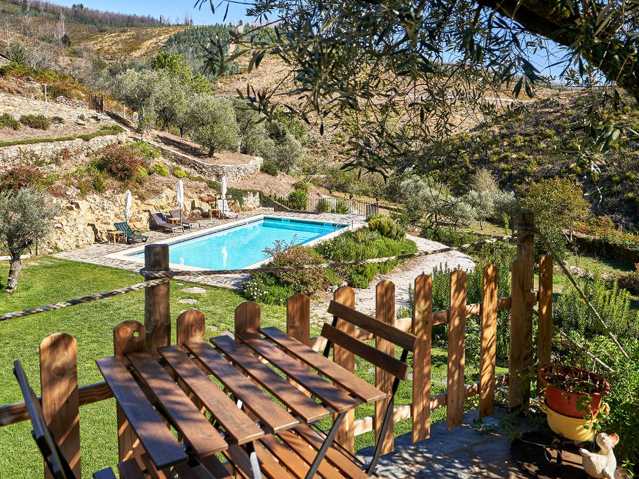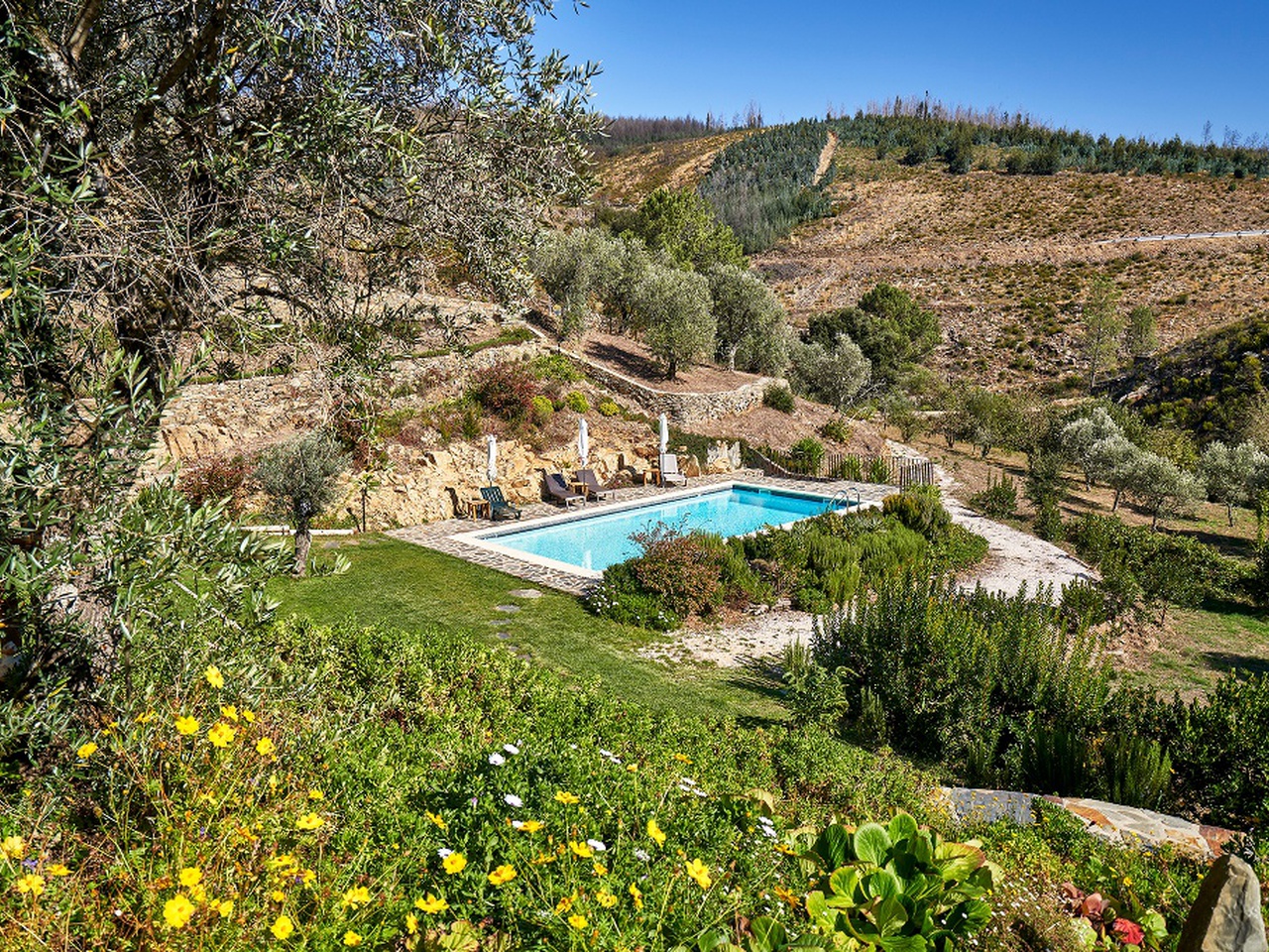 Os vários socalcos de paredes conferem ao espaço um ambiente singular e são uma das características mais marcantes desta propriedade, que se integra de forma harmoniosa na paisagem envolvente e onde o silêncio é apenas quebrado pelo cantar dos pássaros e pelo correr das águas cristalinas no ribeiro ao lado.